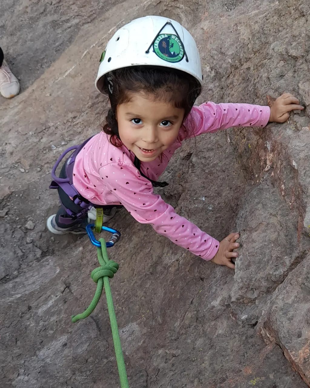 Tenemos dos grupos de participantes, para los menores de 10 años nuestro objetivo fue iniciar a niños y niñas en la escalada deportiva, educar sobre el entorno, el cuidado del medio y las prácticas seguras y responsables por lo que se realizó una clase teórica sobre el equipo para la escalada deportiva y después nos dedicamos a escalar con la cuerda pasada a las cadenas (donde termina cada ruta de escalada) que es la forma más segura para iniciarse en el deporte (pueden ver las fotos para entender a que me refiero).