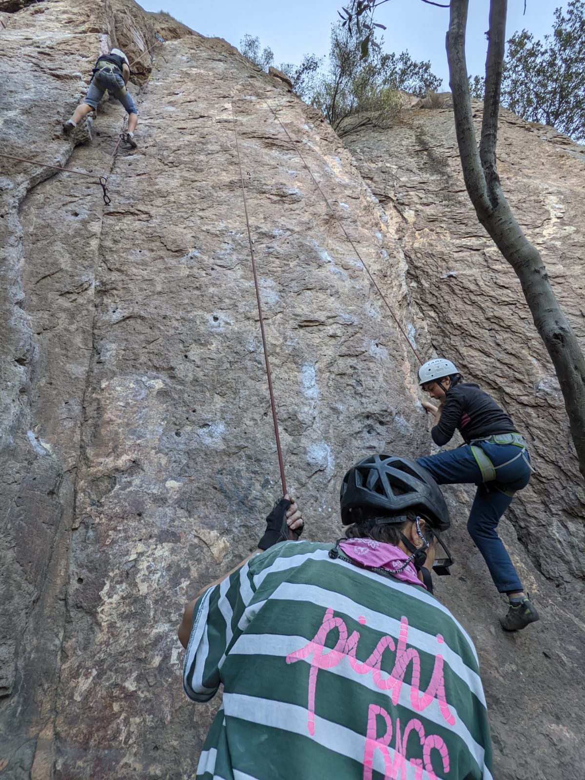 En el proceso de nuestro programa en el deporte de la escalada, aparte de los talleres semanales que se realizan en el muro que construimos en el centro deportivo Malaquias Concha, realizamos salidas a roca para ir enseñando las técnicas y los procedimientos a lo/as participantes junto con la práctica misma del deporte.