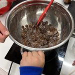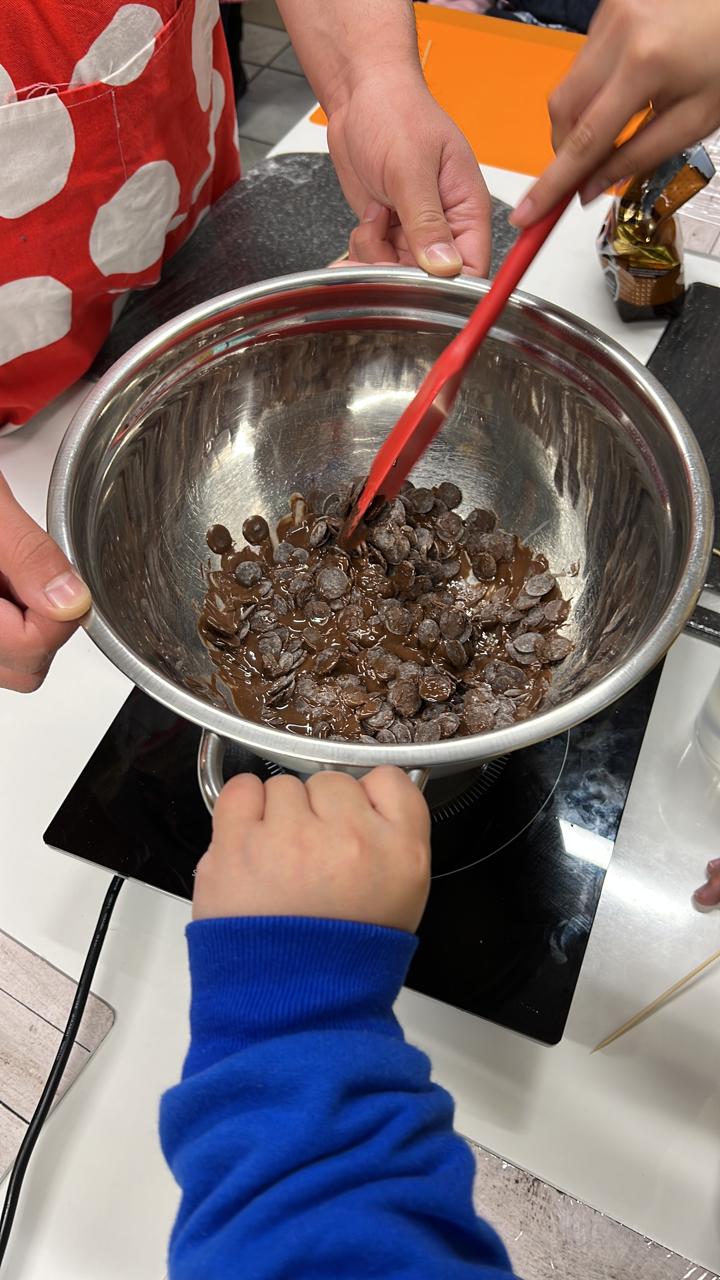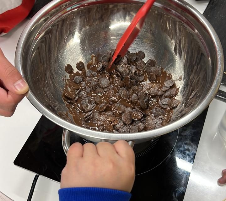 La segunda patita consistió en colocar el mix de chocolates blanco y semi amargo, previamente derretidos en baño María o microondas, en los moldes entregados.