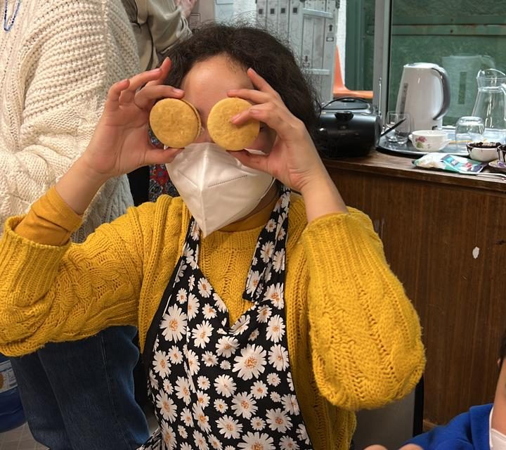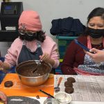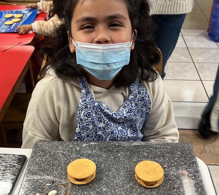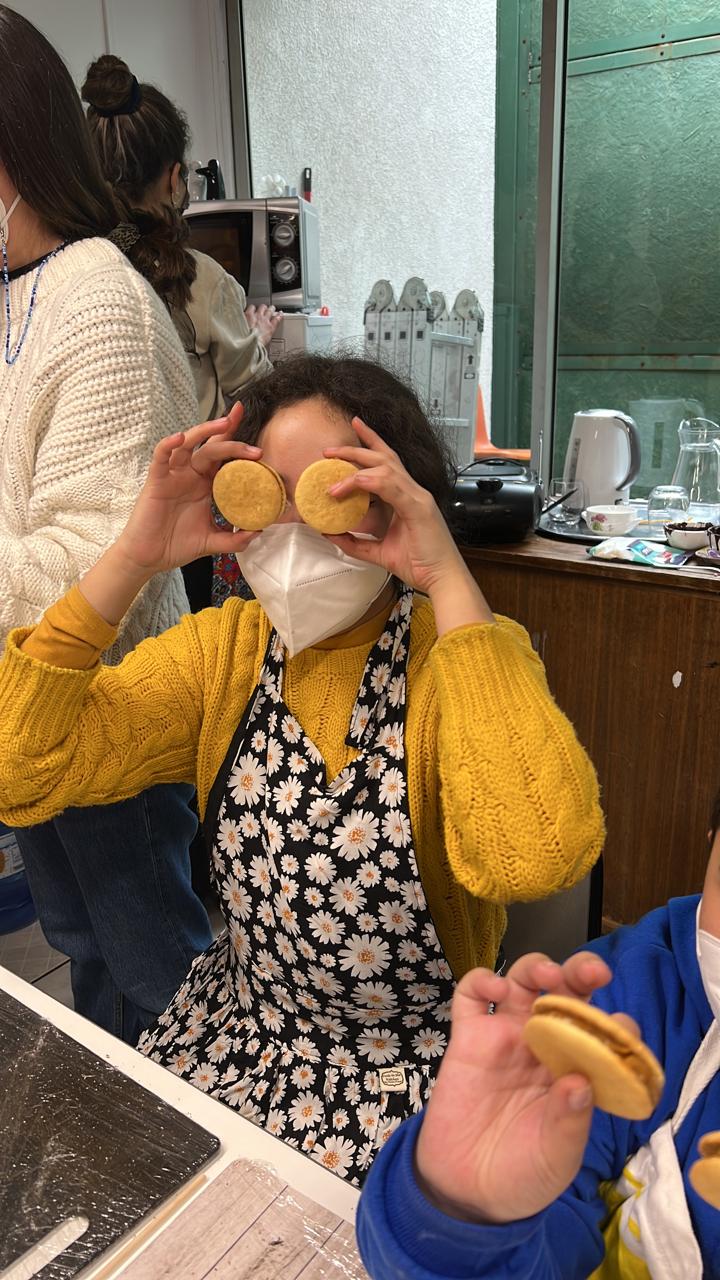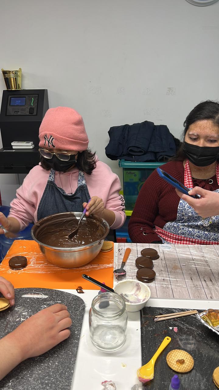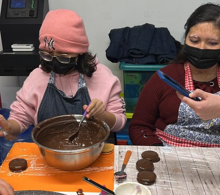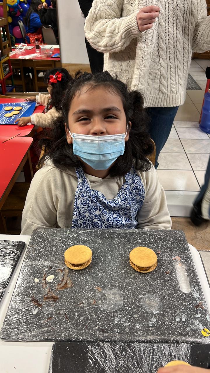 La jornada inició aprendiendo a armar el alfajor donde se indicó a lo/as participantes poner la mitad de las galletas en la mesa y con ayuda de una manga, poner el manjar en el centro y tapar con otra galleta.