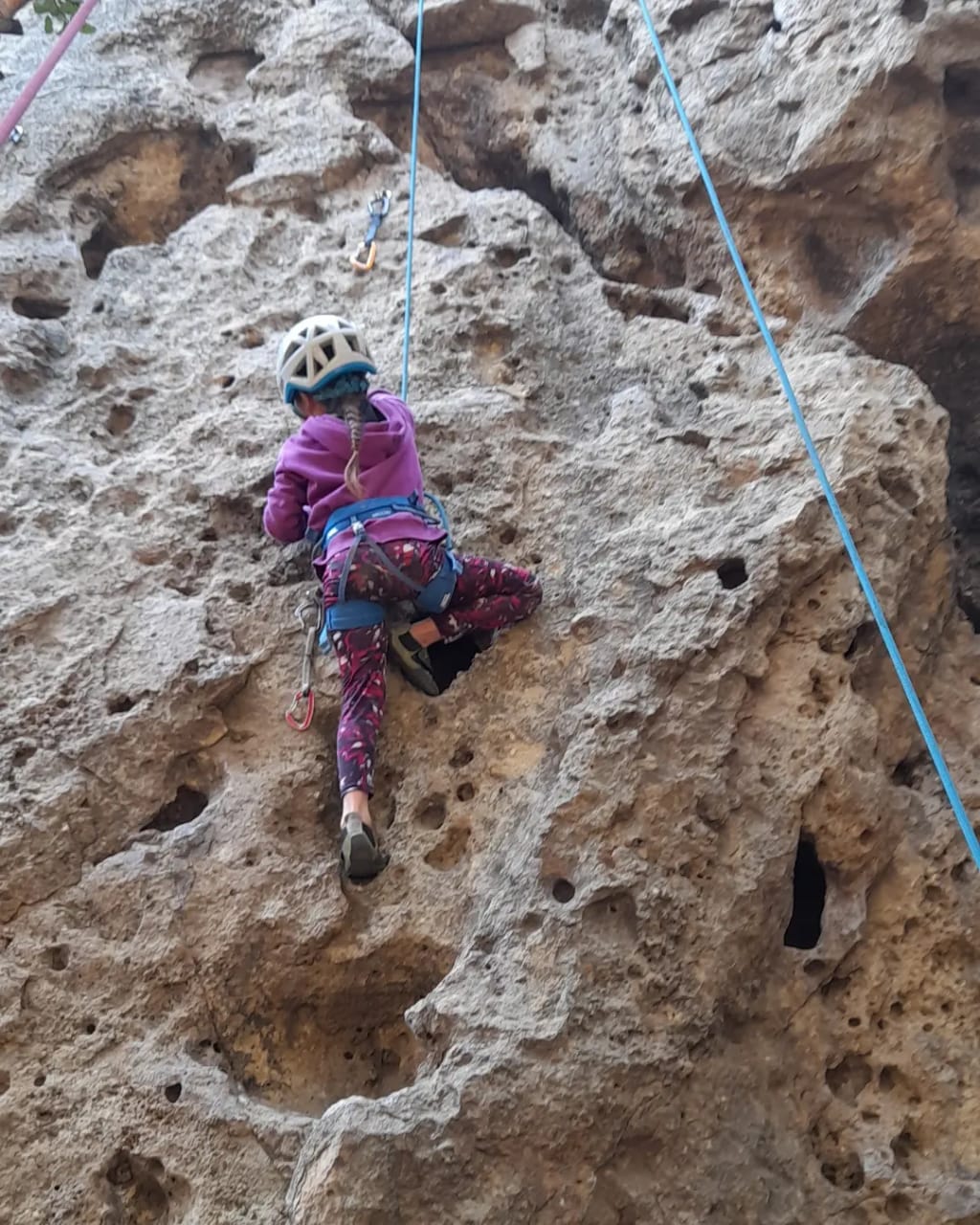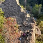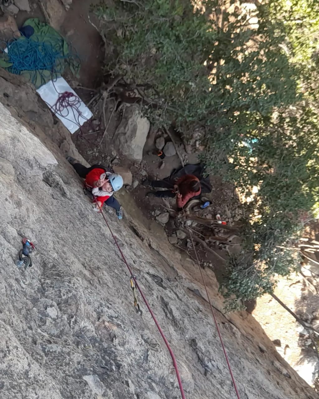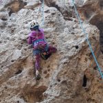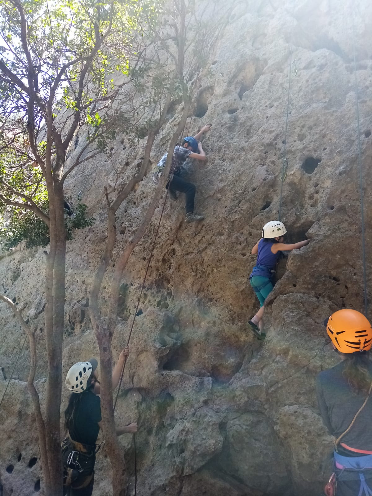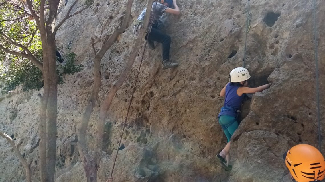En la jornada se siguió aprendiendo sobre las técnicas de escalada y practicando en la modalidad “top rope” donde la cuerda está puesta en la cadena a través de una reunión lo que hace la práctica más segura y menos intensa psicológicamente hablando ya que si te caes no vuelas. También, para lo/as que ya están más asimilado/as con el proceso de escalar y se sienten más seguro/as, comenzamos a practicar las escalada en lead, es decir, se escala en libre y se van colocando los seguros intermedios hasta que se llega al punto final de la ruta.